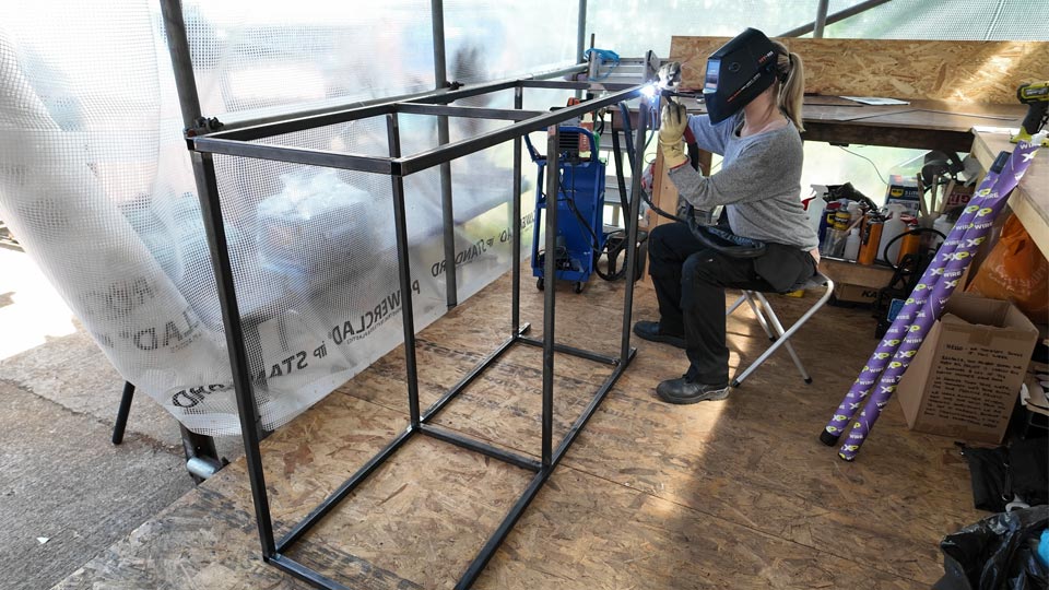 We built the frame from 25x25mm steel box section, 2mm thick, and used scrap plywood we had lying around for the shelves. The TIG welder came out again, this time on steel, and although the welds weren’t all exactly “stacked dimes”, the frame held firm.